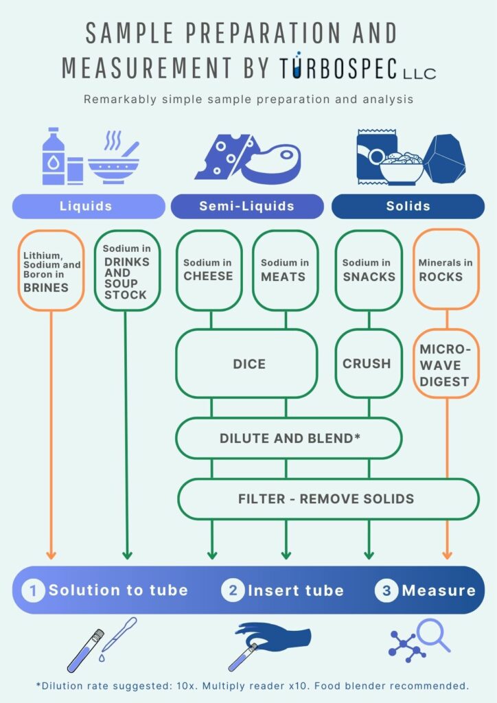The Turbospec’s advanced and patented technology allows you to conduct precise analyses and quality control for diverse samples such as brines, broths, sauces, and saline solutions. The Turbospec e400 ensures accurate measurements for elements like Sodium, Lithium, Boron, Fluorine, Phosphorus, Aluminum, and more. It also offers product configurations that can measure the concentration of up to four elements per unit.